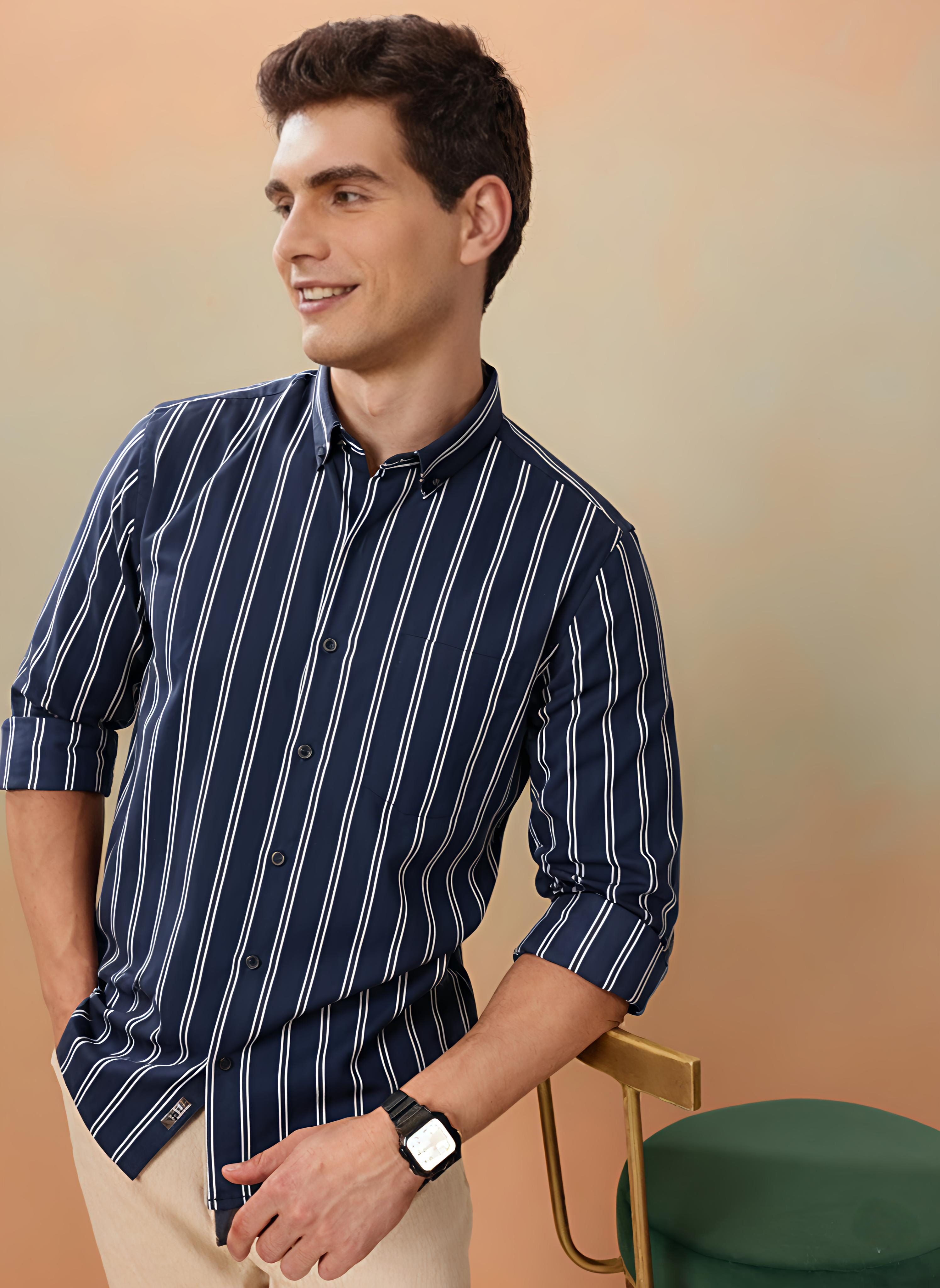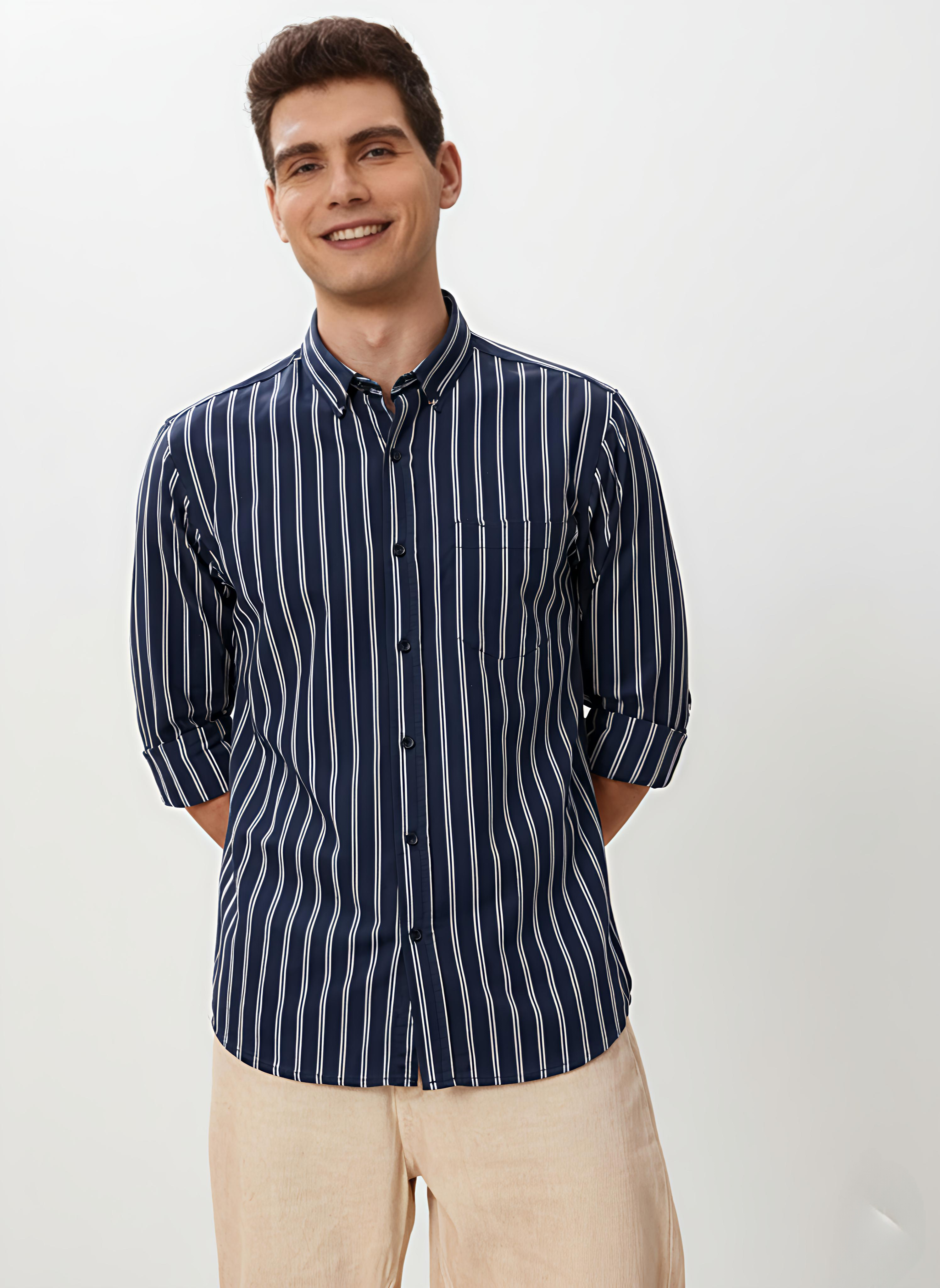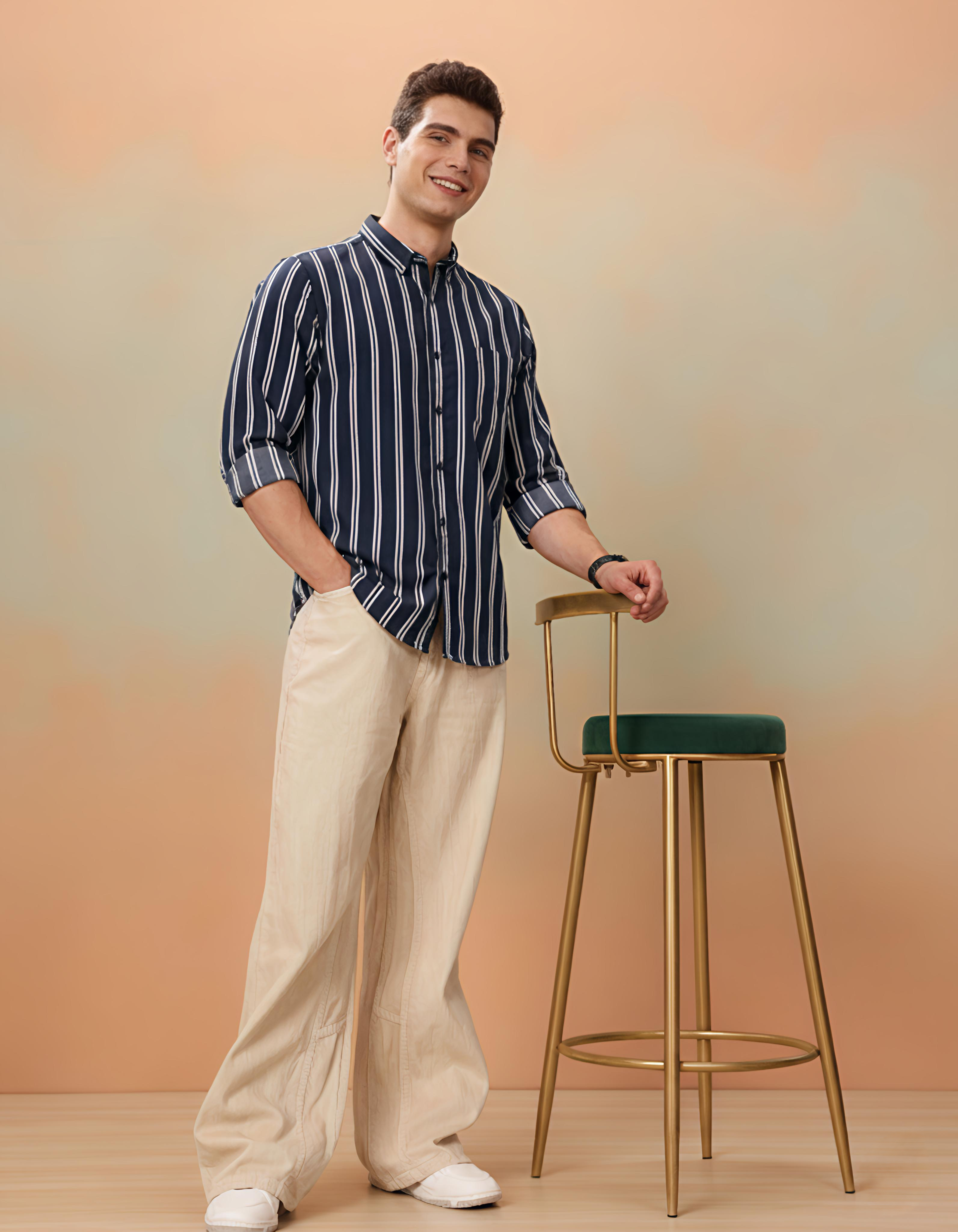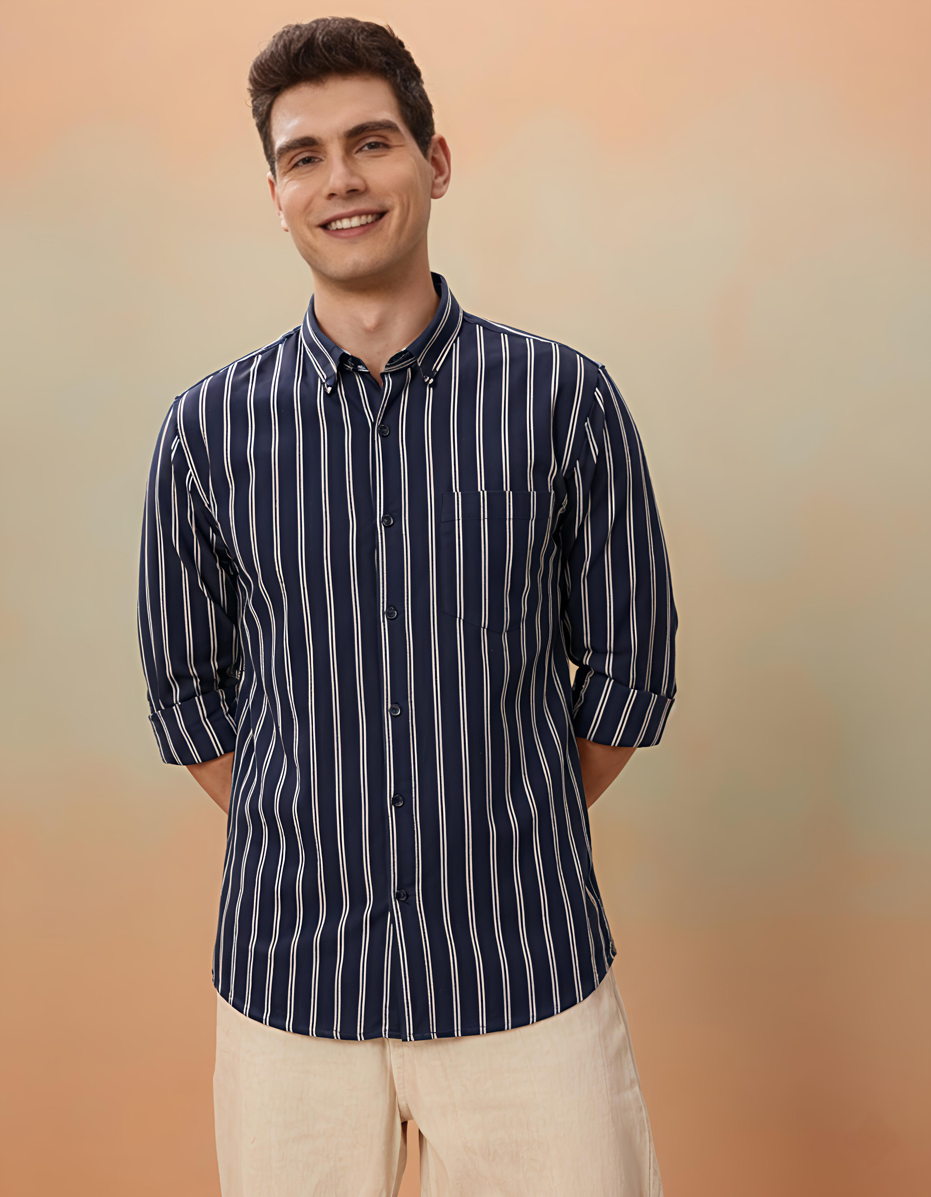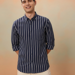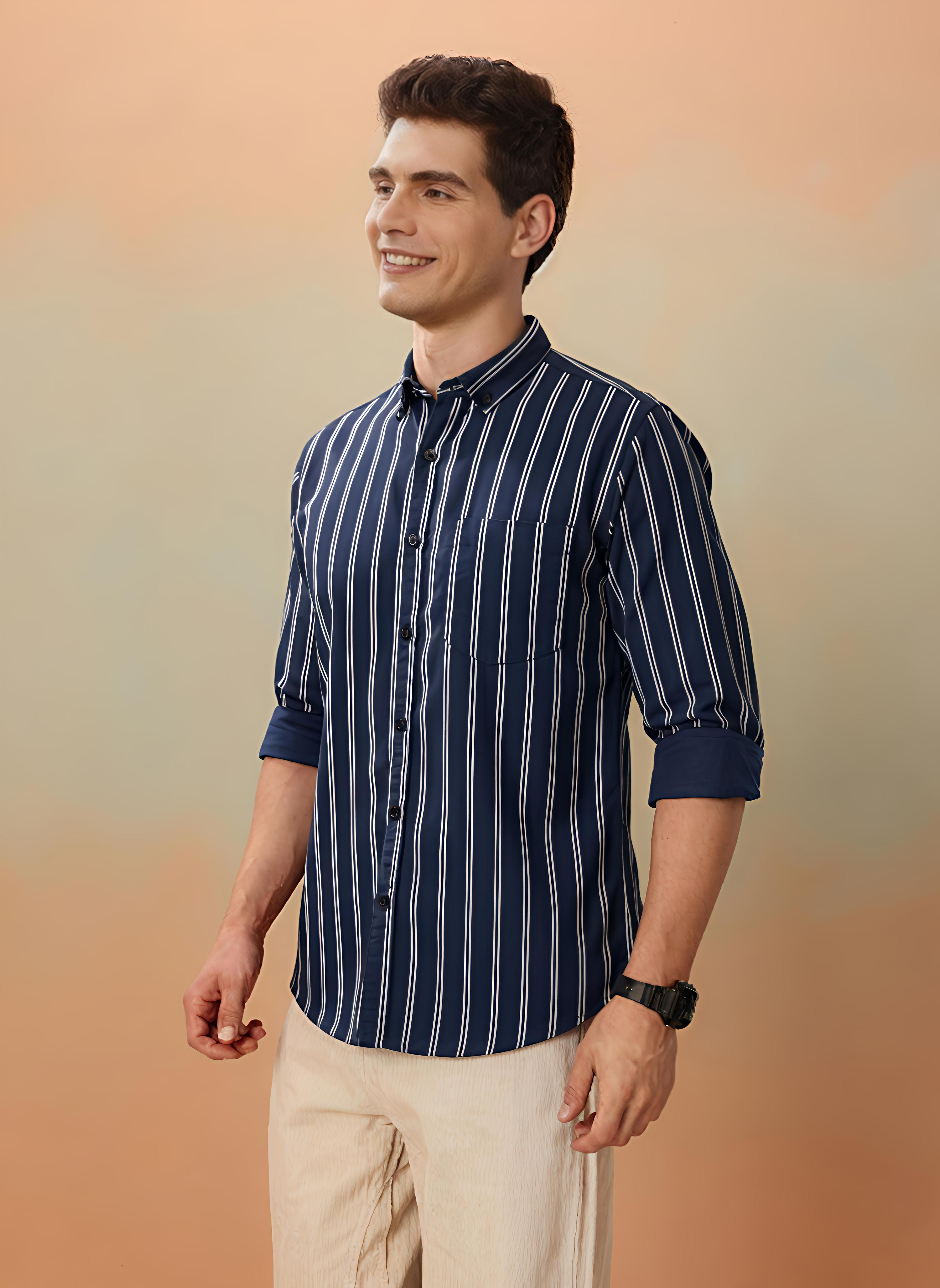 Its regular fit ensures lasting comfort, while the fine stripes add subtle detail without overwhelming the look. Whether it’s worn with tailored chinos or light-wash denim, this full-sleeve shirt nails that clean, refined edge you want from a wardrobe staple.