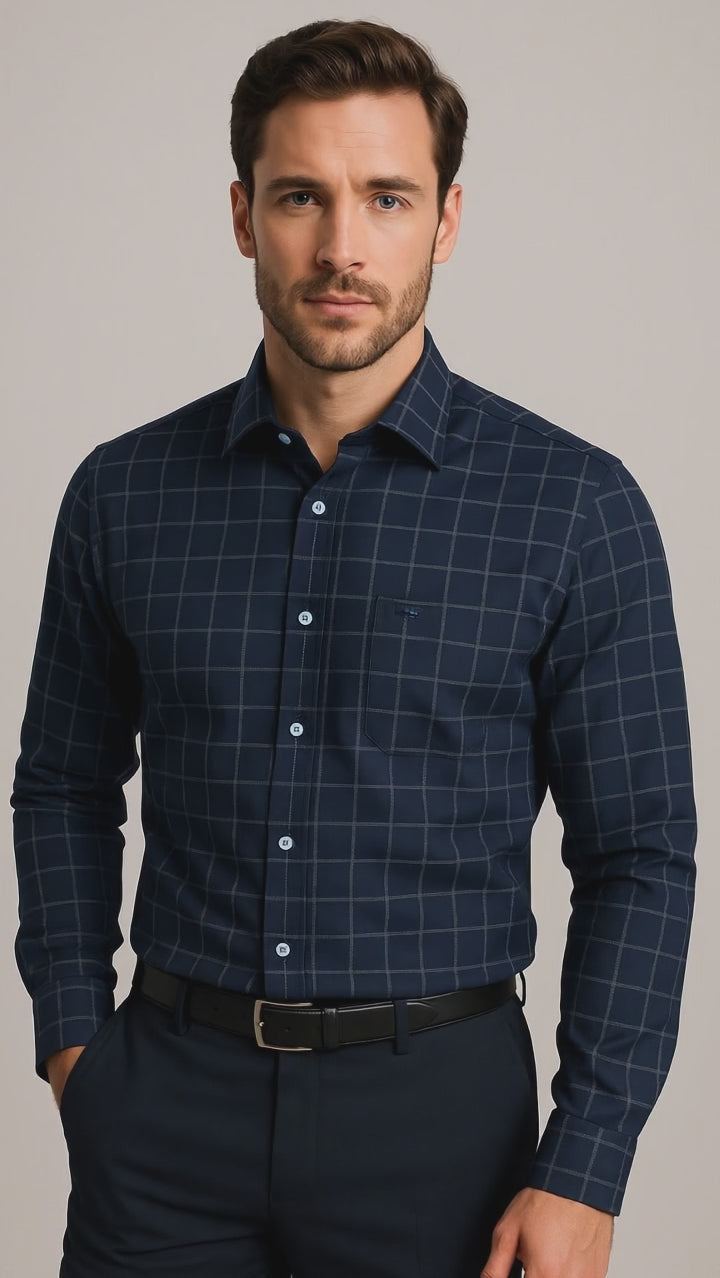Command attention with subtlety in this Men’s Navy Blue Cotton Shirt, tailored in a slim fit with premium 100% cotton for everyday comfort and sharp looks. The deep navy hue offers endless styling options — wear it solo or layer it up for a polished, confident vibe.