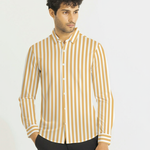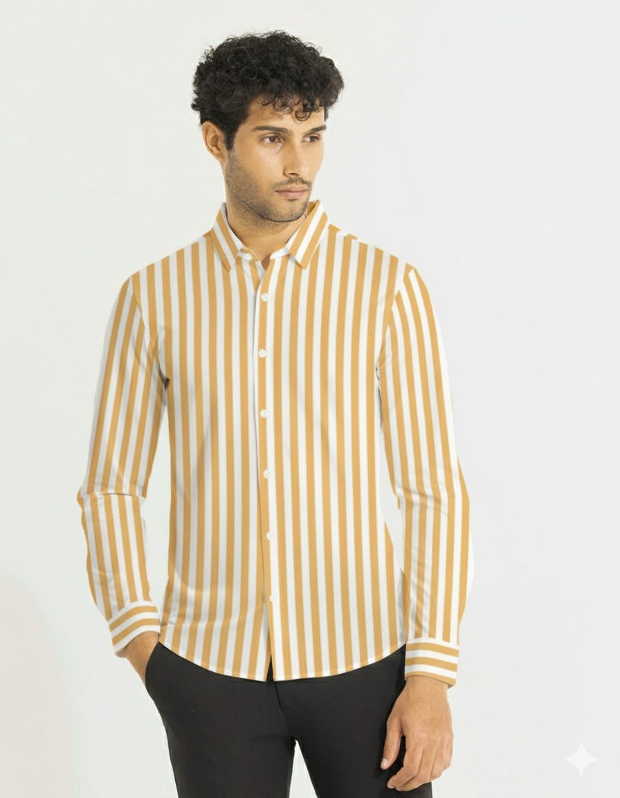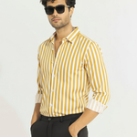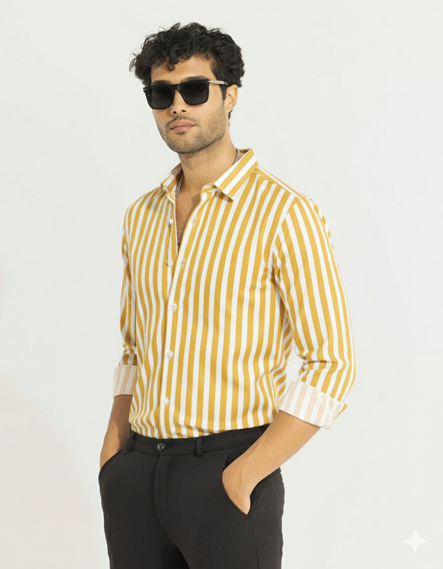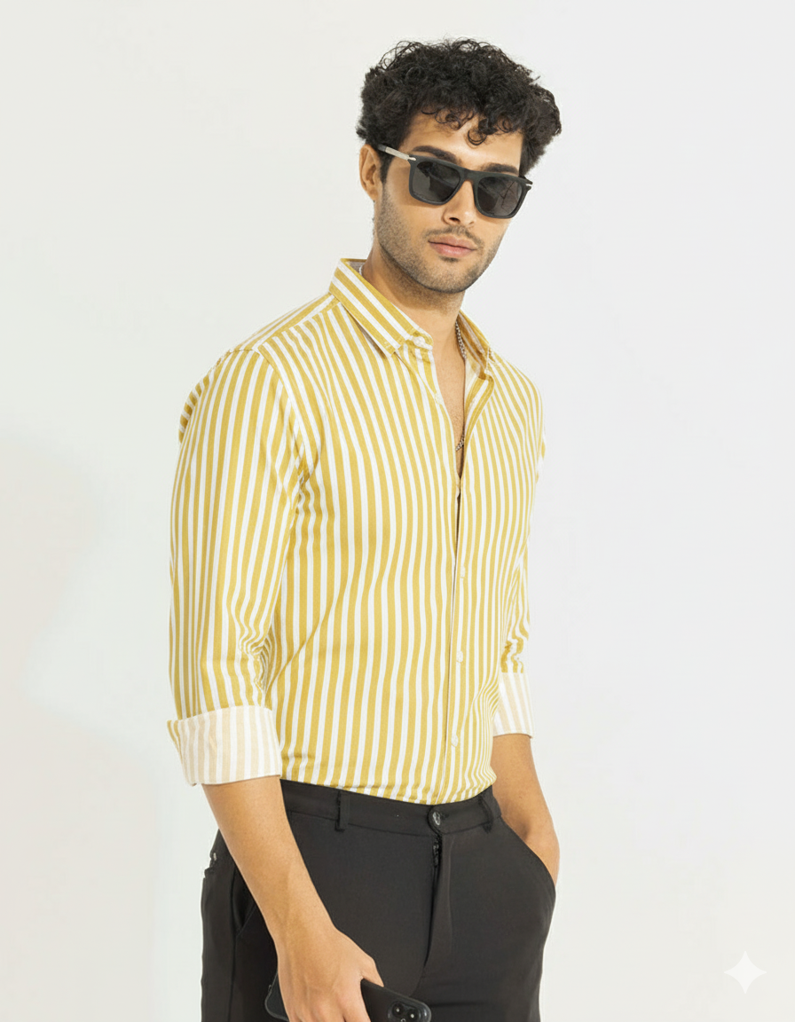 Bring subtle charm and polished style to your wardrobe with the SunTrail Sandy Yellow Striped Shirt — a refined piece crafted from soft, breathable Giza cotton. Designed for the modern professional, this shirt features fine vertical stripes in a warm sandy yellow palette that offers a fresh twist on traditional patterns. Whether you're stepping into a casual meeting or heading out for a weekend brunch, it blends comfort and style seamlessly.